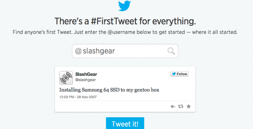 Mas parece que o Twitter deu uma ajudinha e disponibilizou, em comemoração aos seus 8 anos no ar, um hotsite para você descobrir o #FirstTweet de qualquer usuário. A ferramenta é mega simples e conta ainda com um botão pra você tweetar sua descoberta.